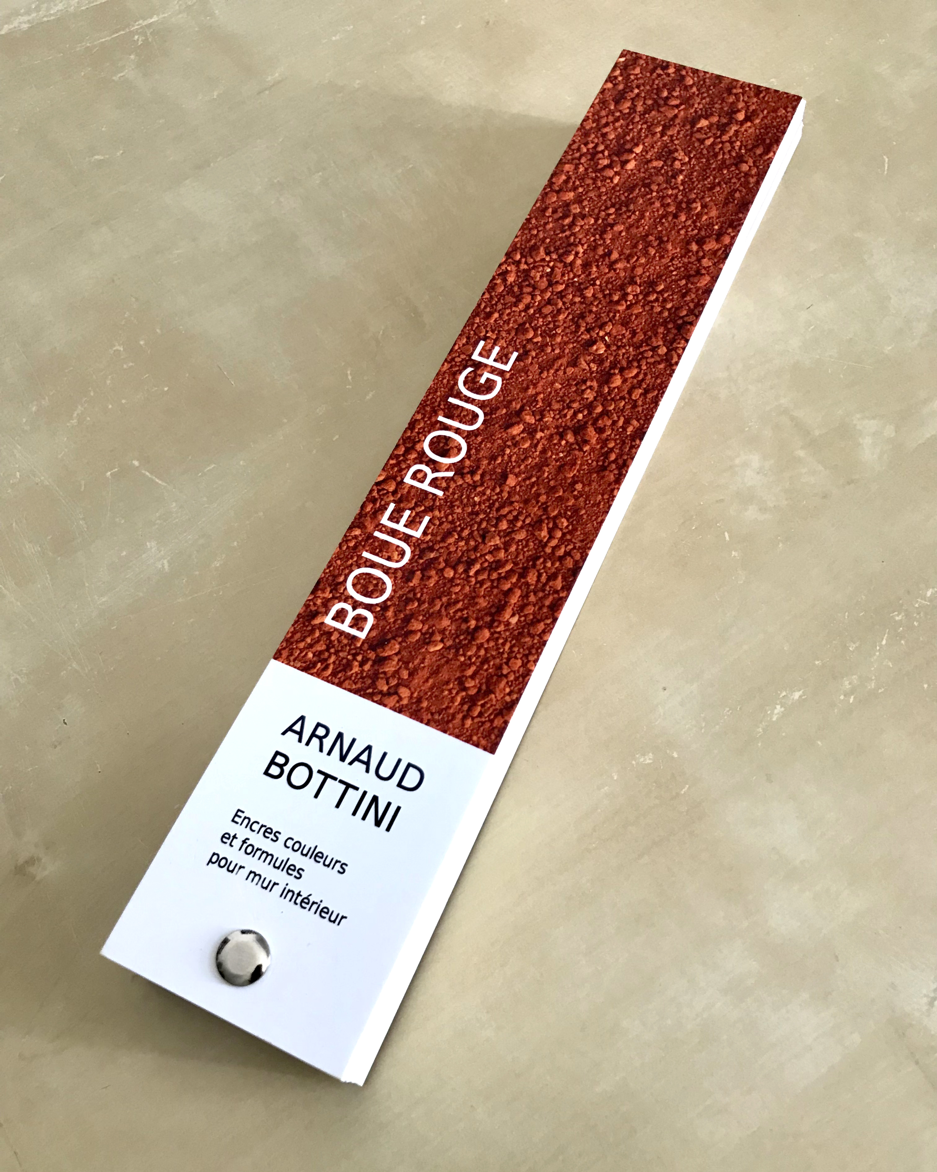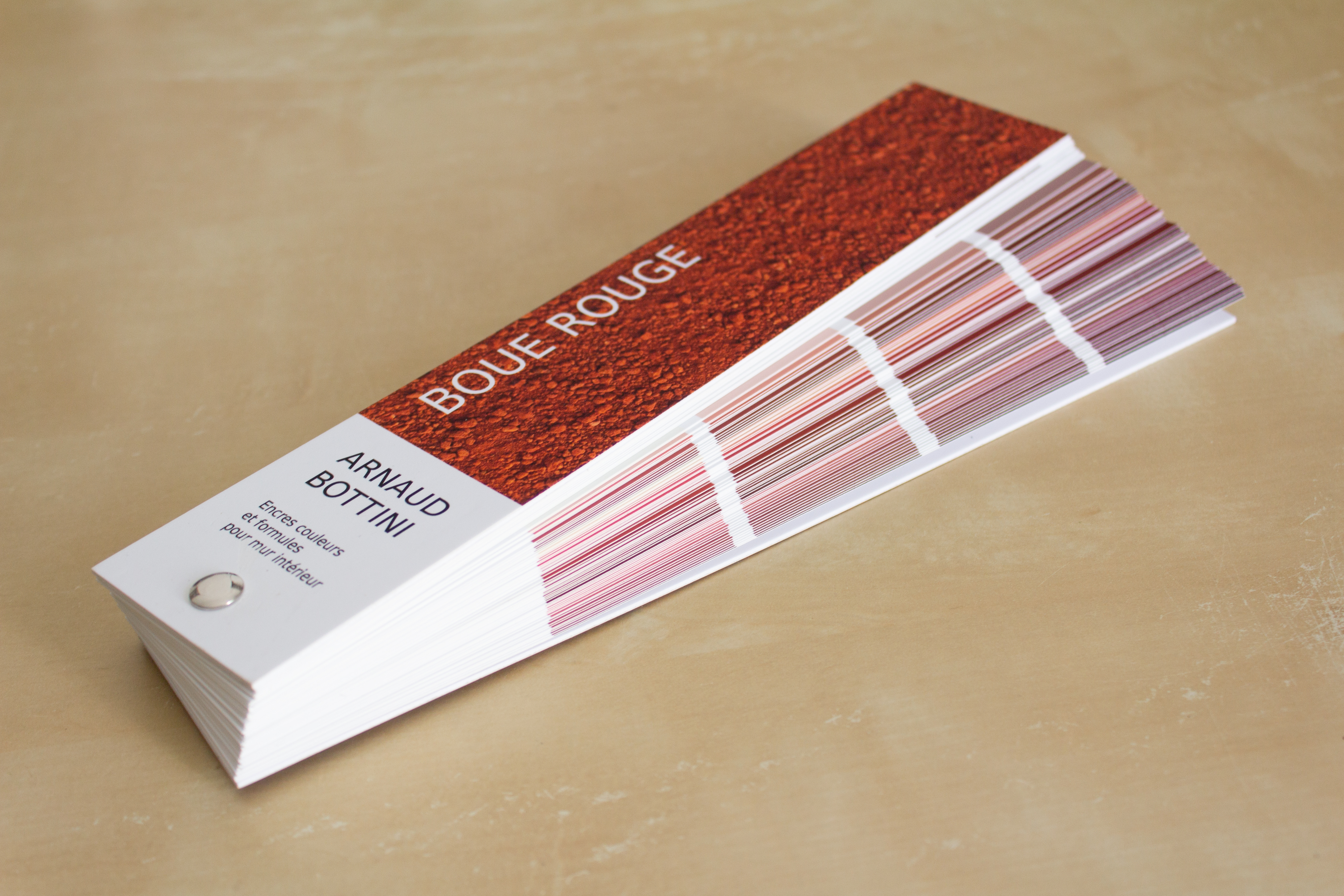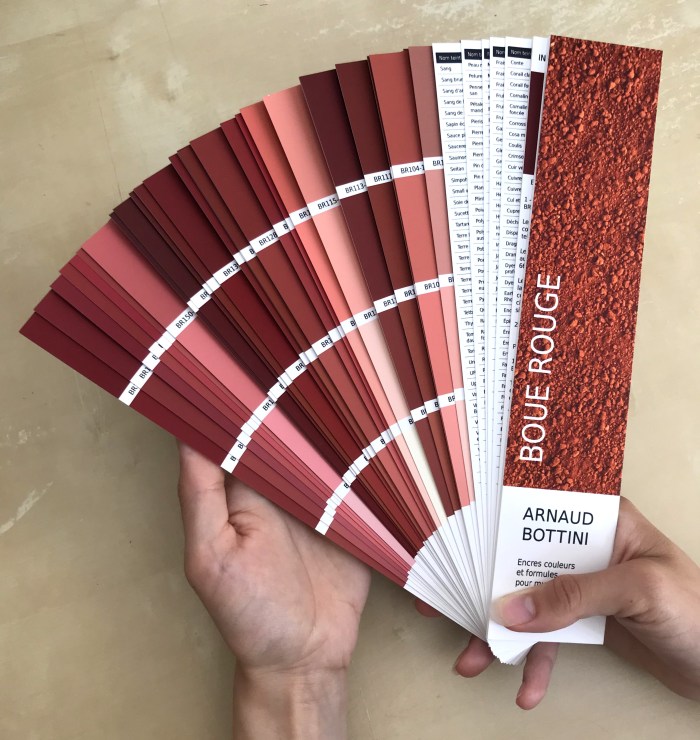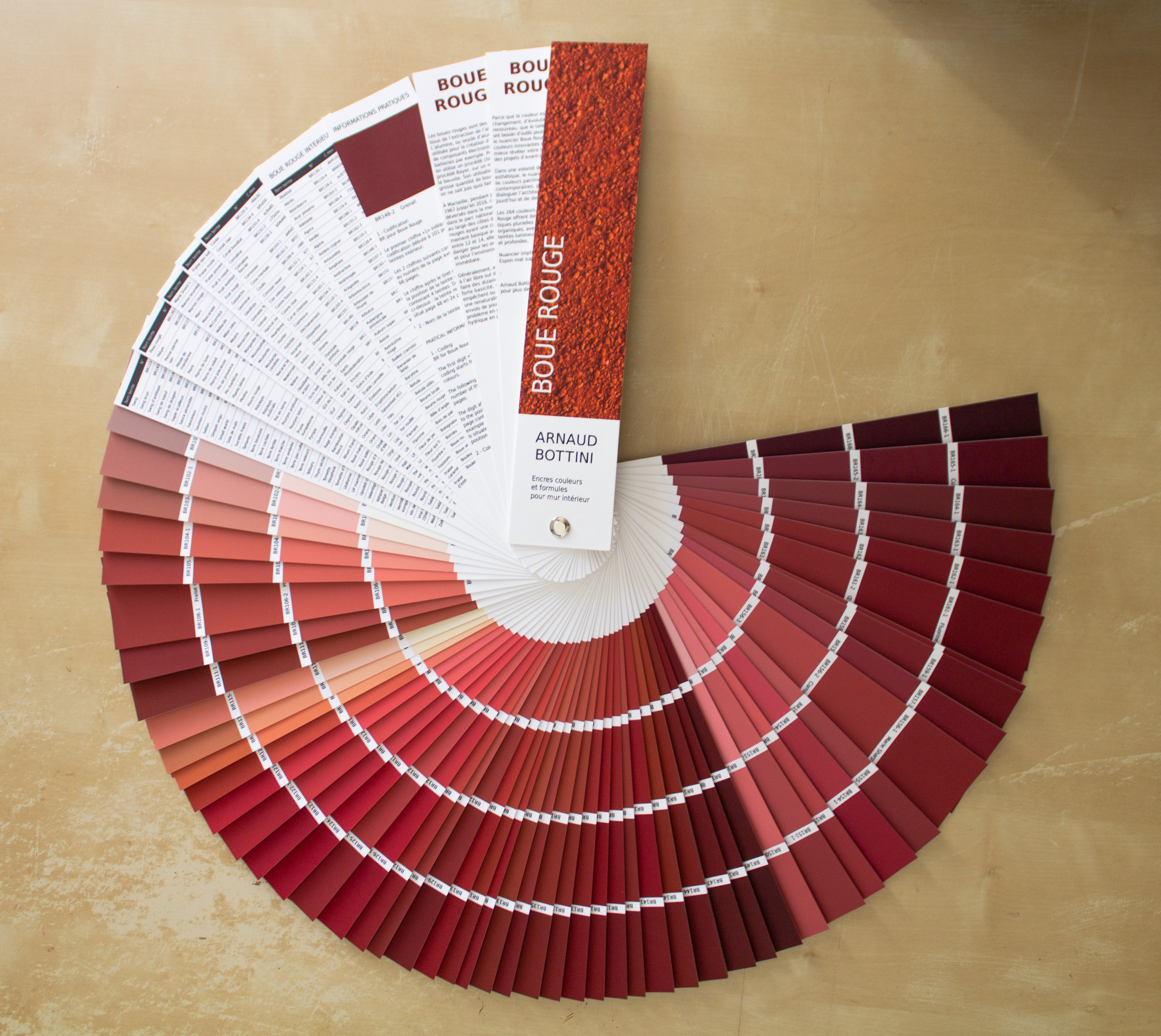 Leur couleur, d’un rouge intense, presque irréel, varie selon les dépôts, les conditions d’oxydation, la lumière. C’est à partir de cette matière que j’ai conçu un nuancier, reprenant les codes de ceux utilisés pour choisir des peintures murales — habituellement associés à la