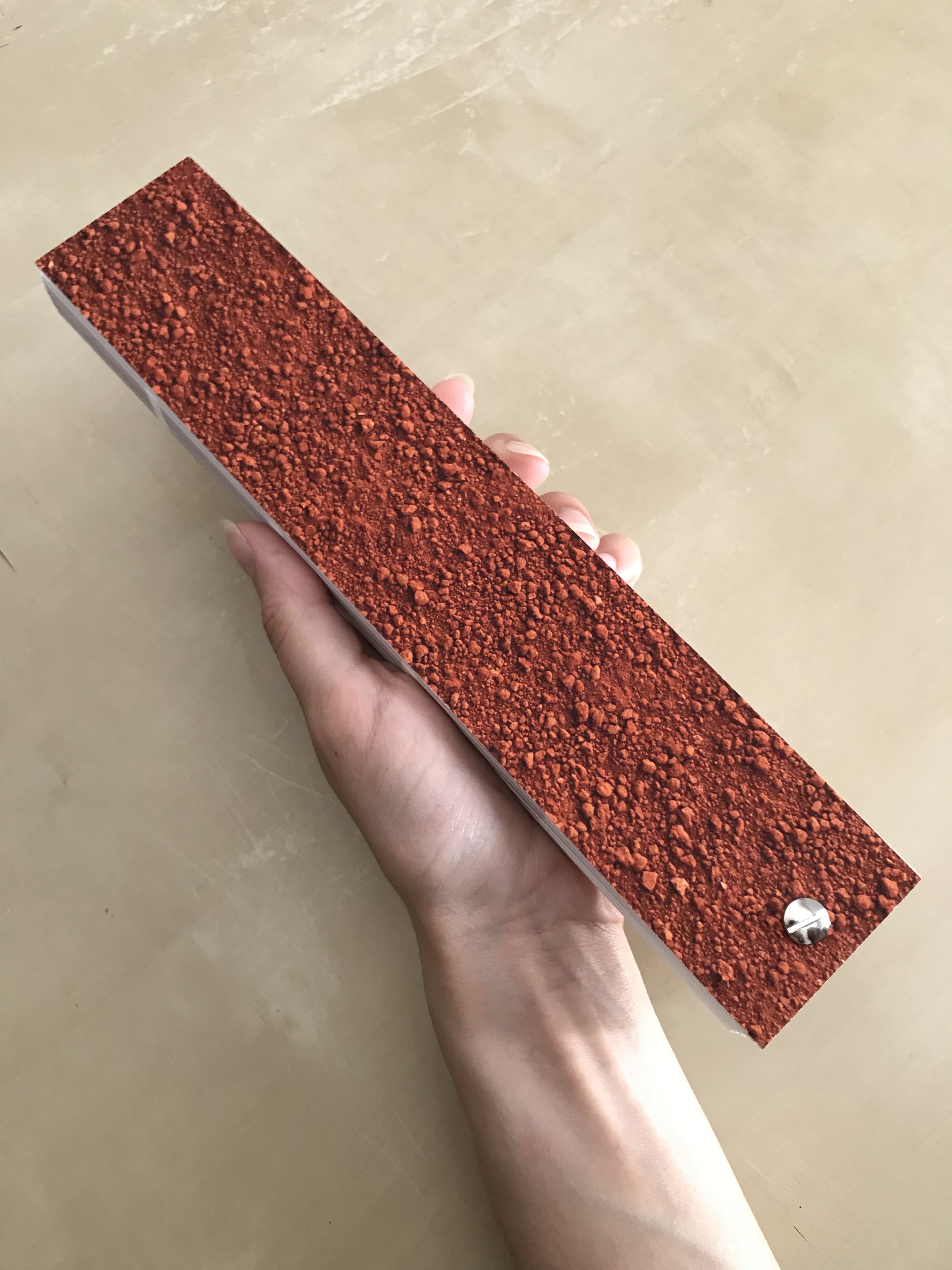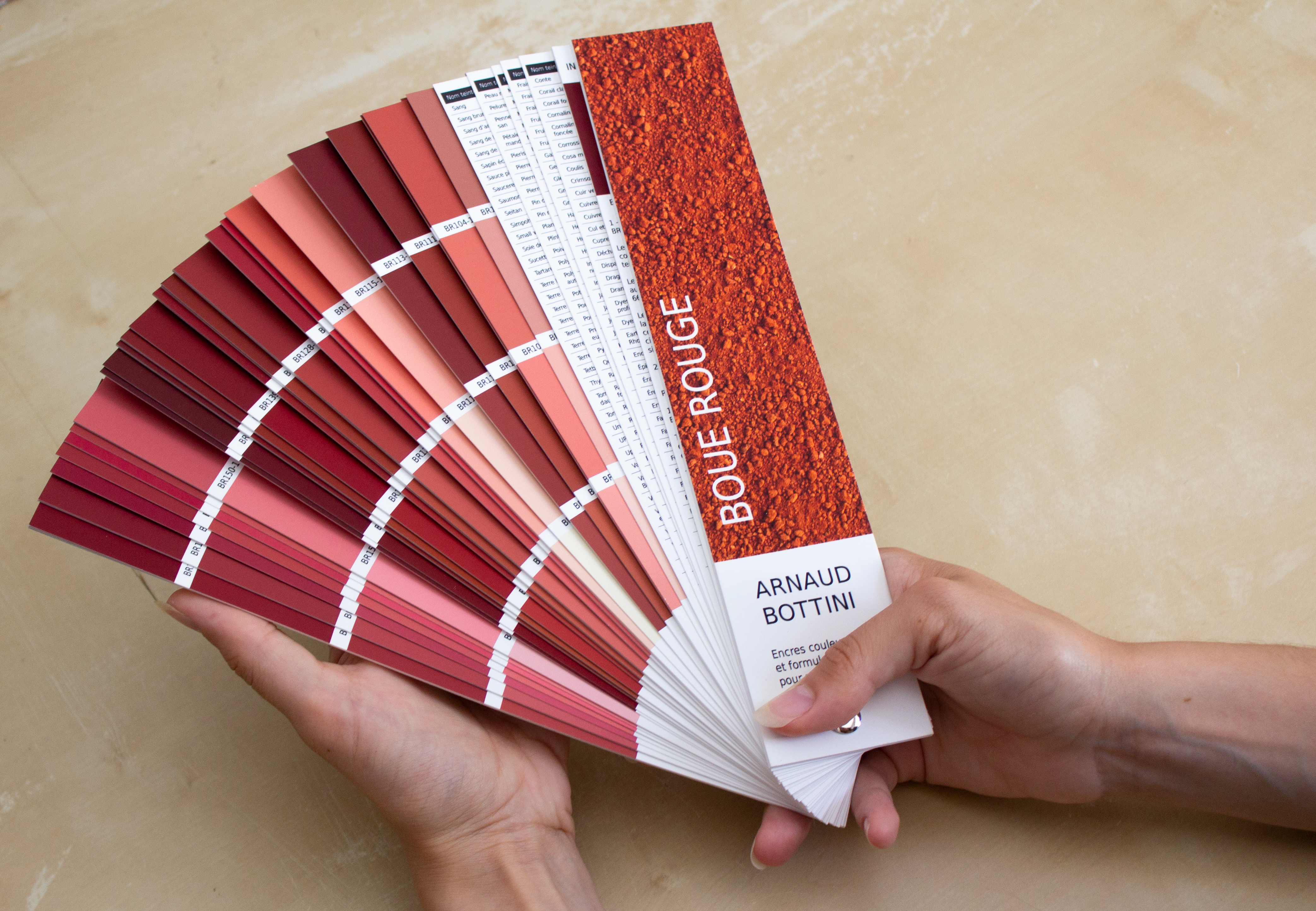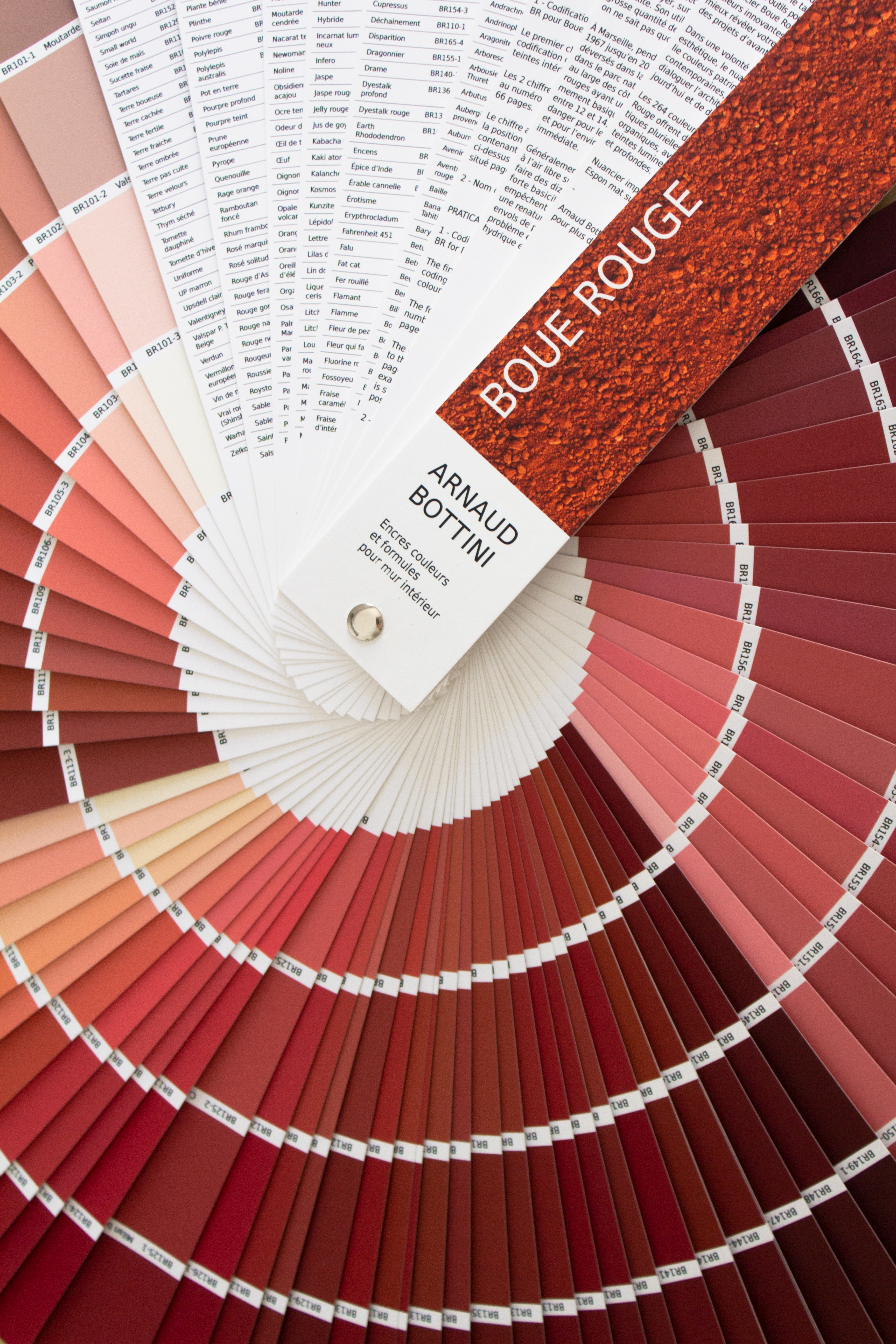 Leur couleur, d’un rouge intense, presque irréel, varie selon les dépôts, les conditions d’oxydation, la lumière. C’est à partir de cette matière que j’ai conçu un nuancier, reprenant les codes de ceux utilisés pour choisir des peintures murales — habituellement associés à la