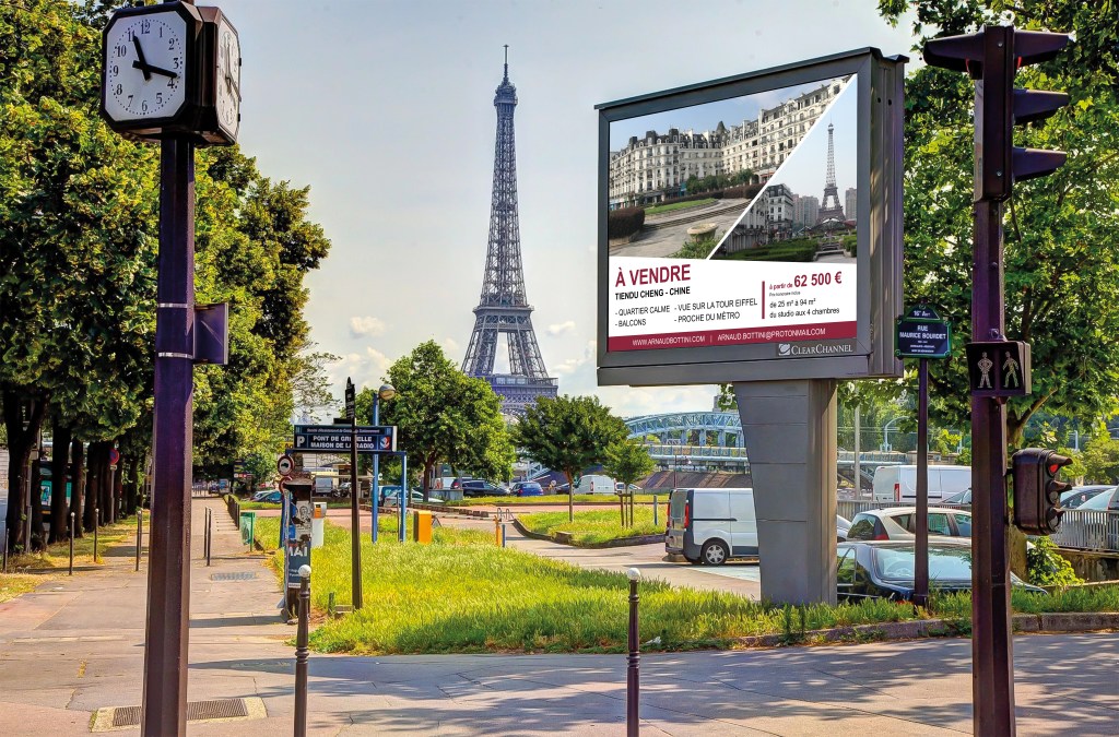 Tiandu Cheng : l’avenir commence ici est une série de fausses publicités immobilières, issue de mon exploration et de mes photographies, pour questionner l’accessibilité de Paris et la consommation de l’image urbaine. Ces publicités, qui imitent les codes classiques de la publicité immobilière, jouent sur l’absurde et l’ironie, invitant les Parisien·ne·s à envisager de s’installer dans une « fausse Paris » : Tiandu Cheng, une ville en Chine.