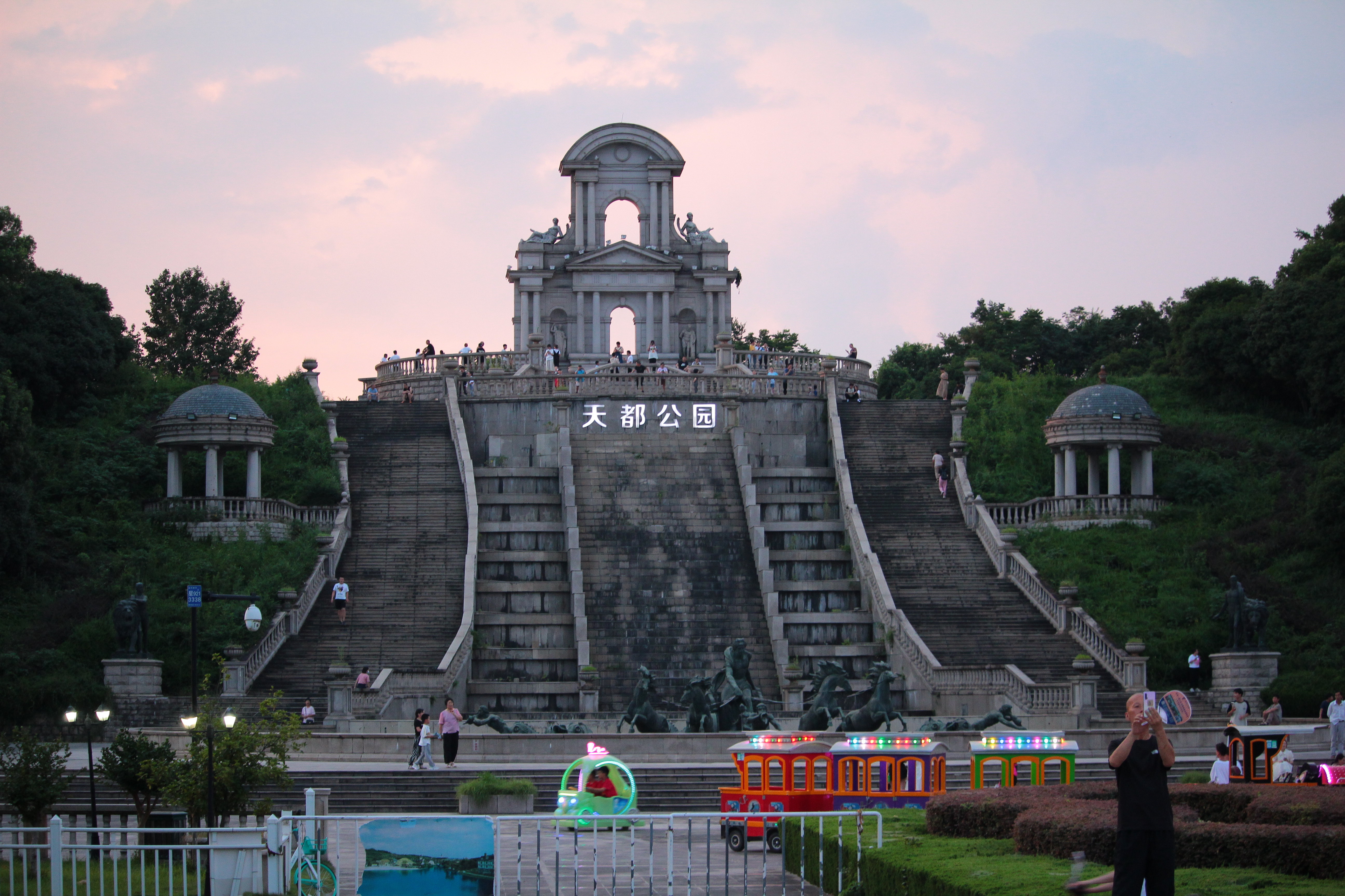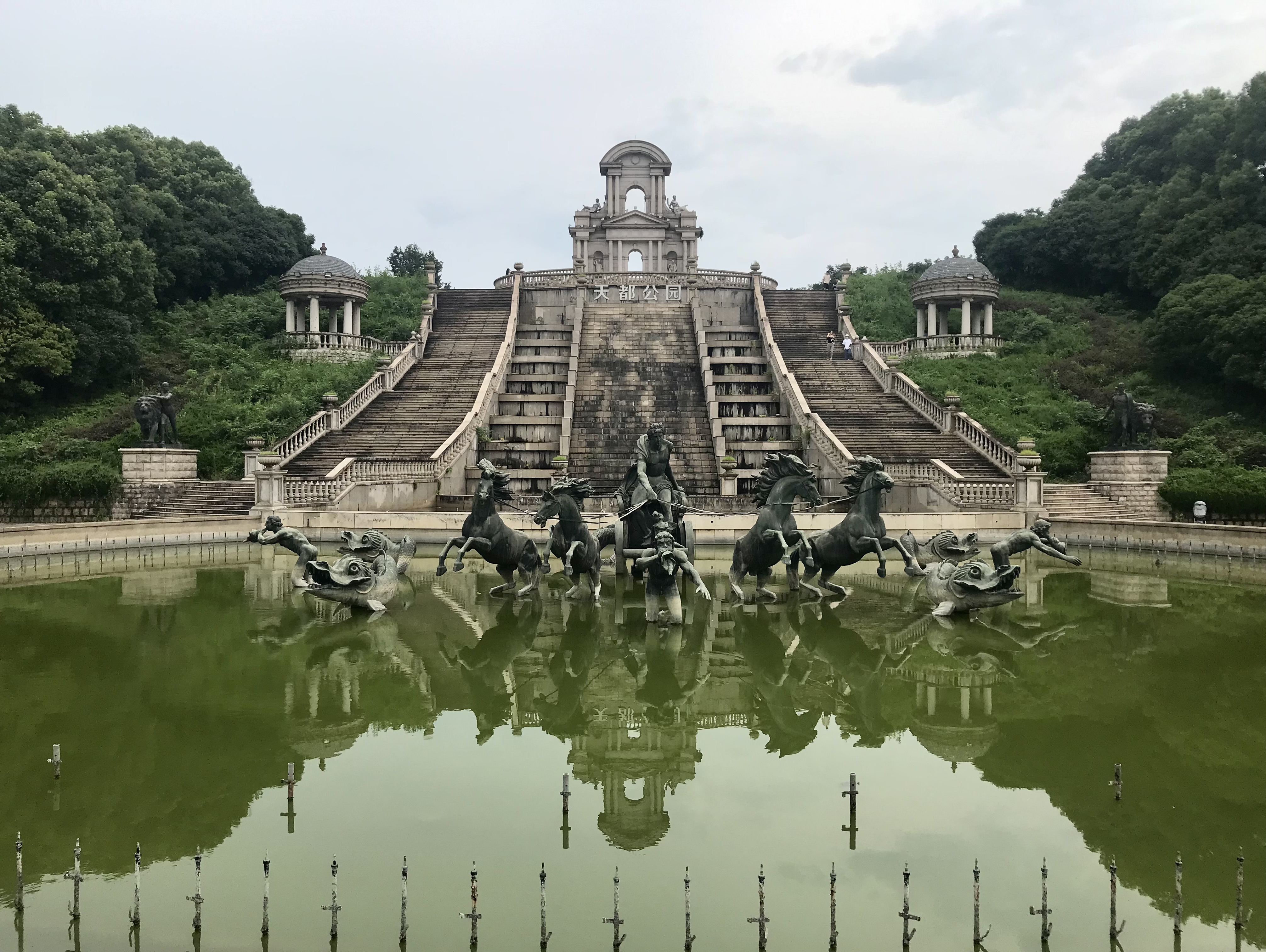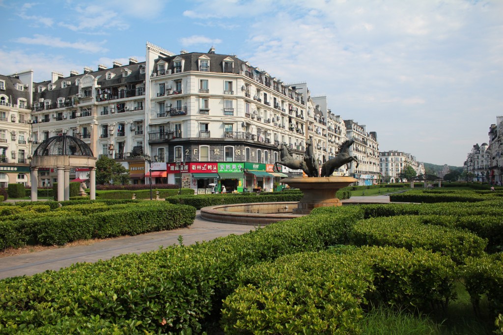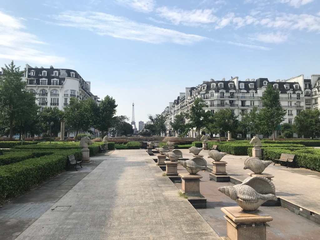 À la fin de cette grande avenue se trouve la seconde partie de la ville: le Tianduparc. C’est un immense parc où l’on y découvre un petit village français et son église, une plage avec des vendeur.deuse.s de glaces, un château au sommet d’une colline, un lac avec des cygnes ou encore un théâtre et son jardin versaillais… On y est accueilli par une reproduction du Char du Soleil, dont l’original se trouve dans le bassin d’Apollon à Versailles. Ici, l’ensemble est surplombé par une inspiration de la fontaine Médicis du jardin du Luxembourg. Plusieurs femmes vêtues de robes se photographient au bord du lac, un couple fraîchement marié éternise leur amour sur fond de Tour Eiffel et d’immeubles parisiens…