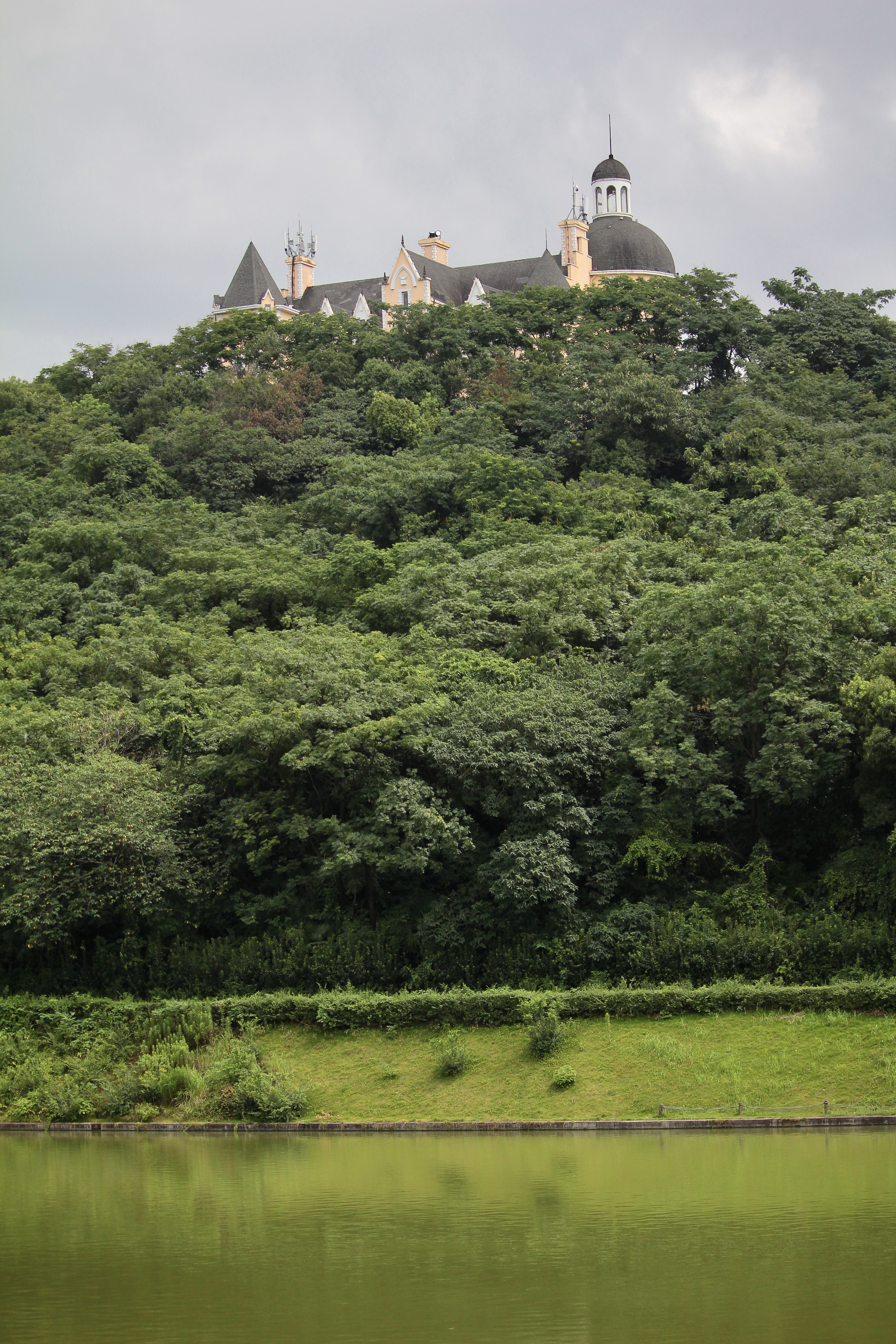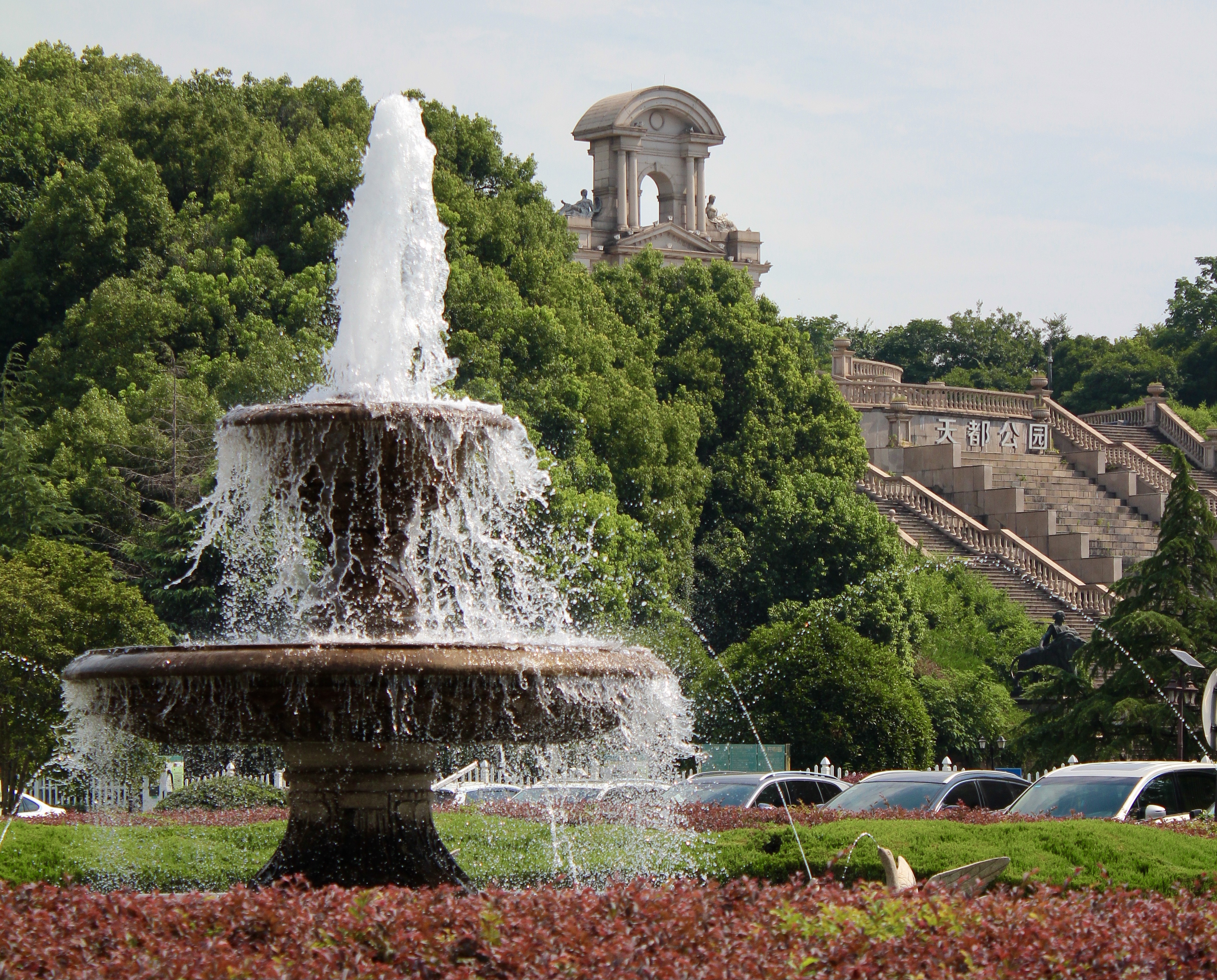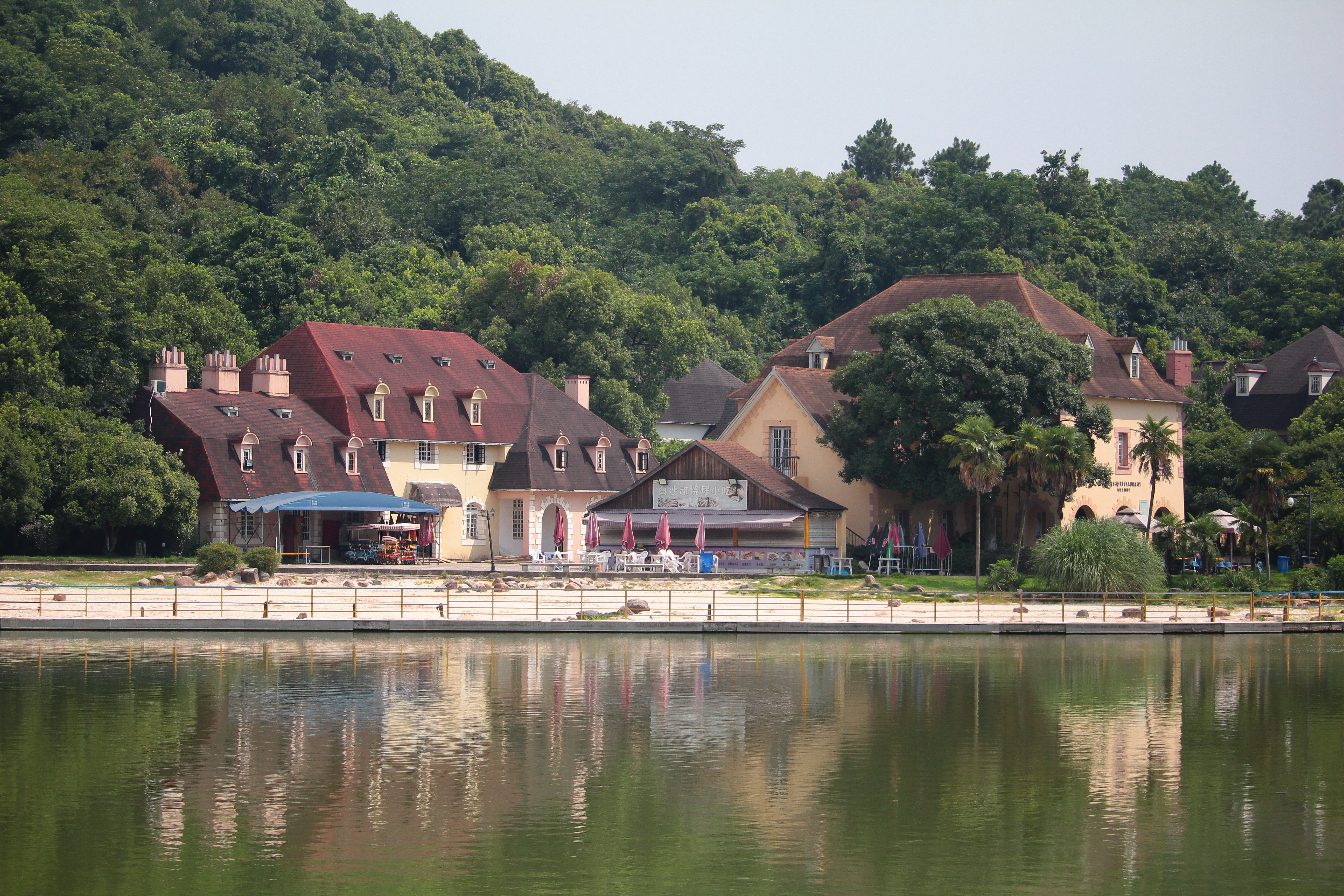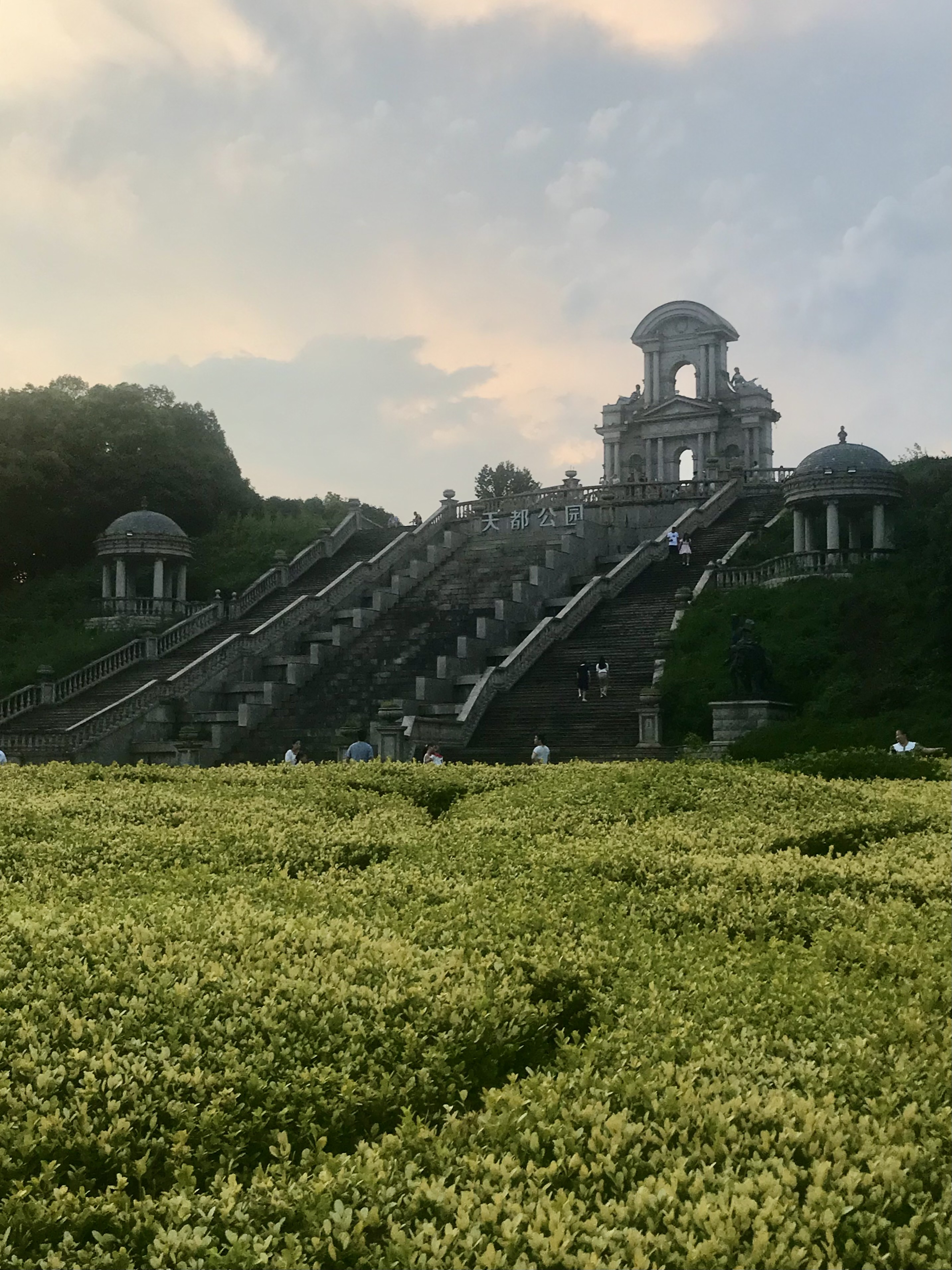 À la fin de cette grande avenue se trouve la seconde partie de la ville: le Tianduparc. C’est un immense parc où l’on y découvre un petit village français et son église, une plage avec des vendeur.deuse.s de glaces, un château au sommet d’une colline, un lac avec des cygnes ou encore un théâtre et son jardin versaillais… On y est accueilli par une reproduction du Char du Soleil, dont l’original se trouve dans le bassin d’Apollon à Versailles. Ici, l’ensemble est surplombé par une inspiration de la fontaine Médicis du jardin du Luxembourg. Plusieurs femmes vêtues de robes se photographient au bord du lac, un couple fraîchement marié éternise leur amour sur fond de Tour Eiffel et d’immeubles parisiens…