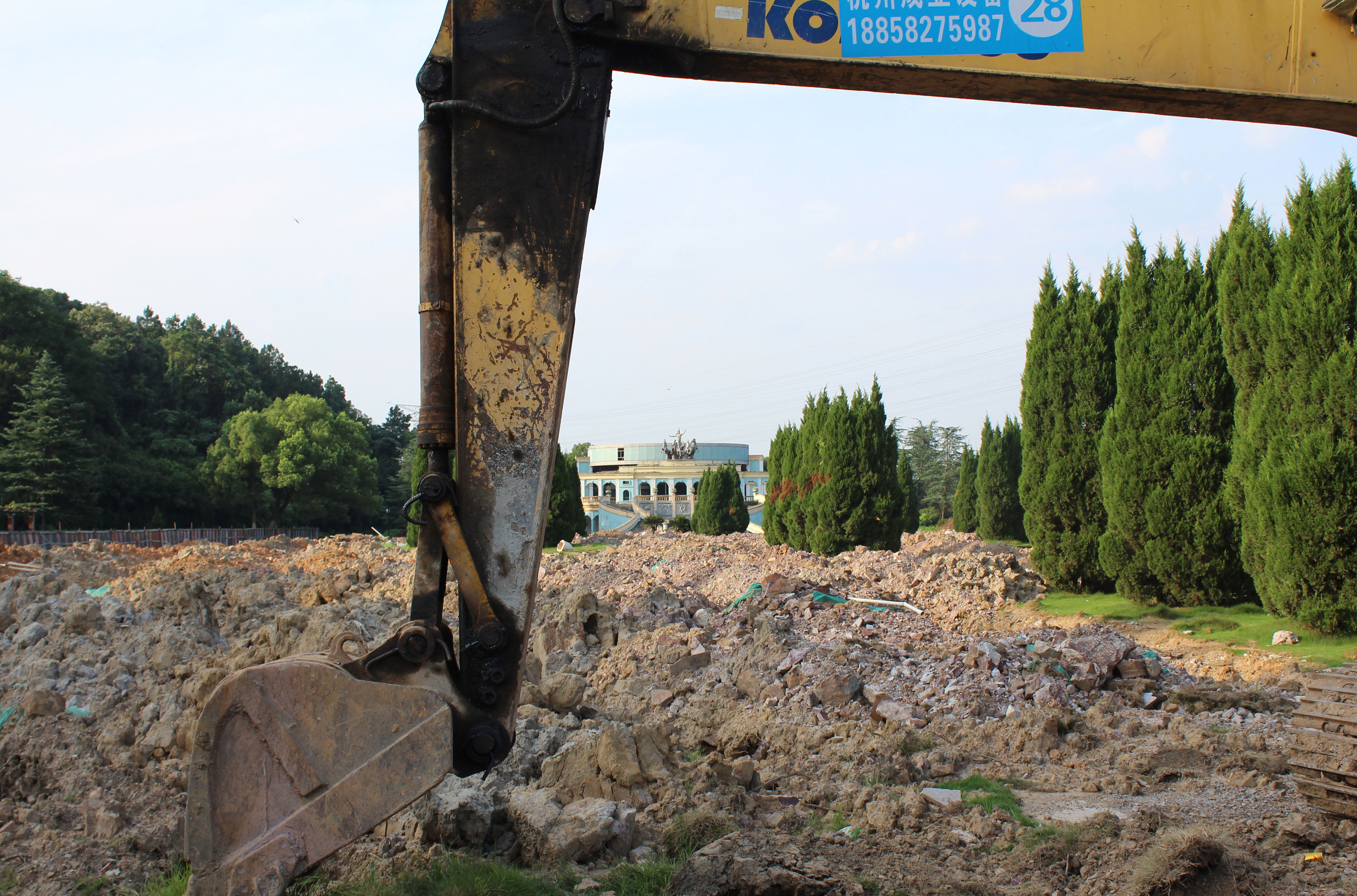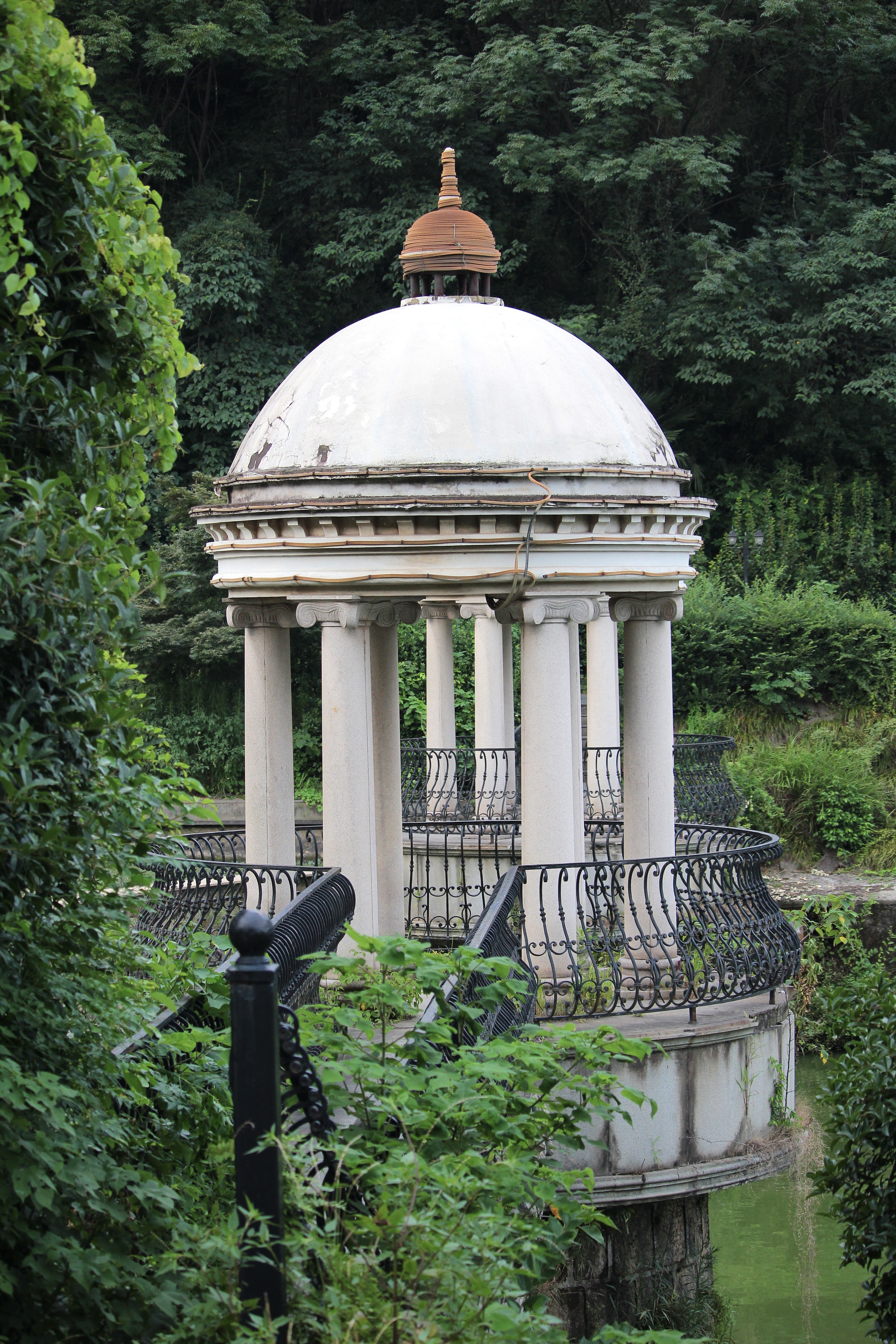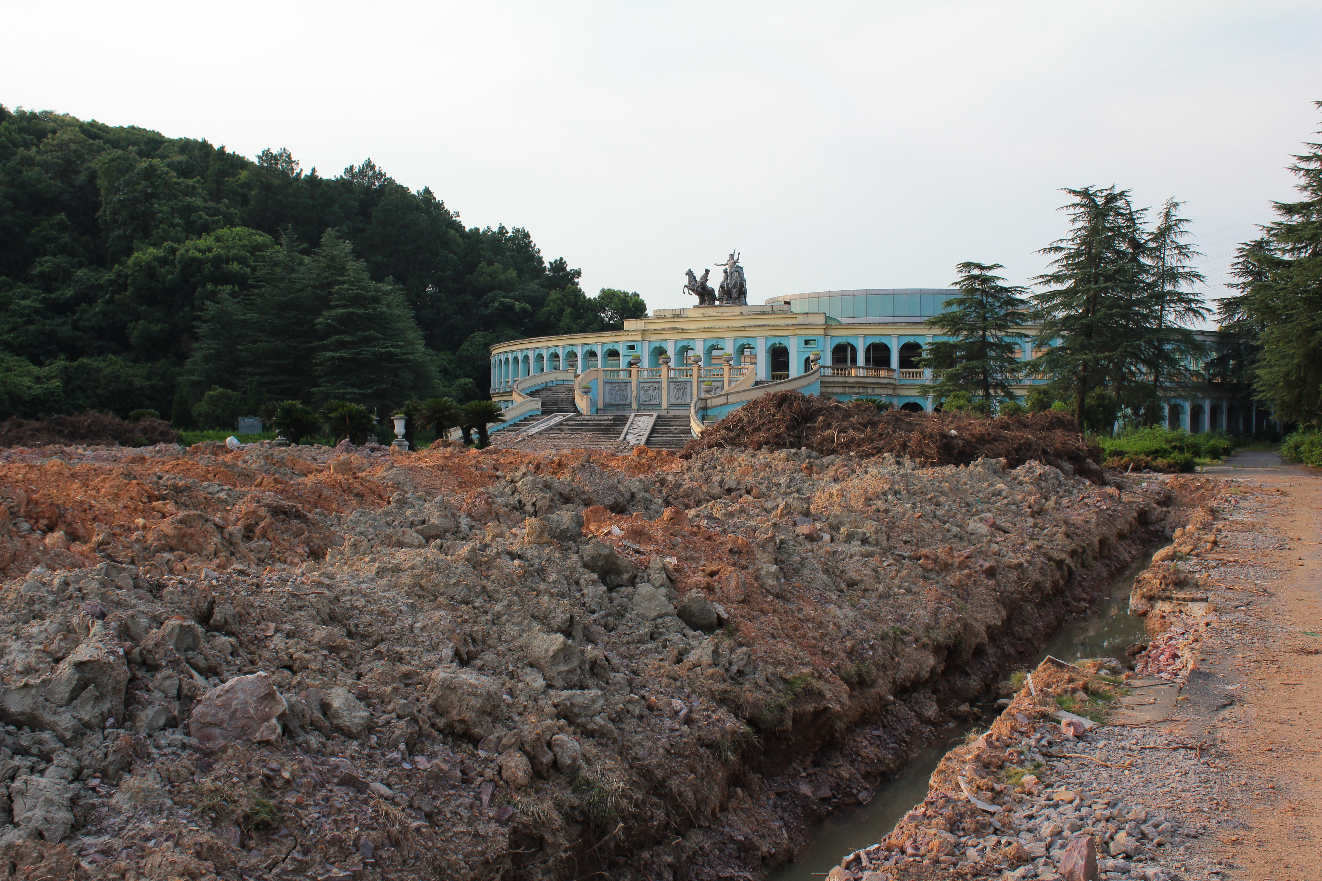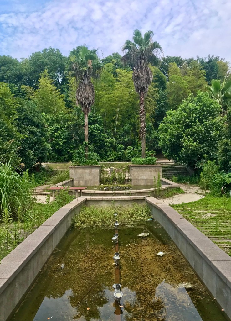 Une des curiosités que je voulais découvrir était le jardin à la française du parc, il se situe juste à côté d’un amphithéâtre. Sur internet, les photographies montraient un espace avec une grande perspective, des fontaines, des buissons aux formes géométriques et bien sûr, une pelouse taillée au ras du sol… finalement, le lieu est désormais interdit au public. En passant ma tête à travers les barrières, je découvre qu’il est complètement ravagé et qu’une tractopelle est toujours présente. En longeant la grille, j’arrive à me frayer un passage vers l’intérieur.