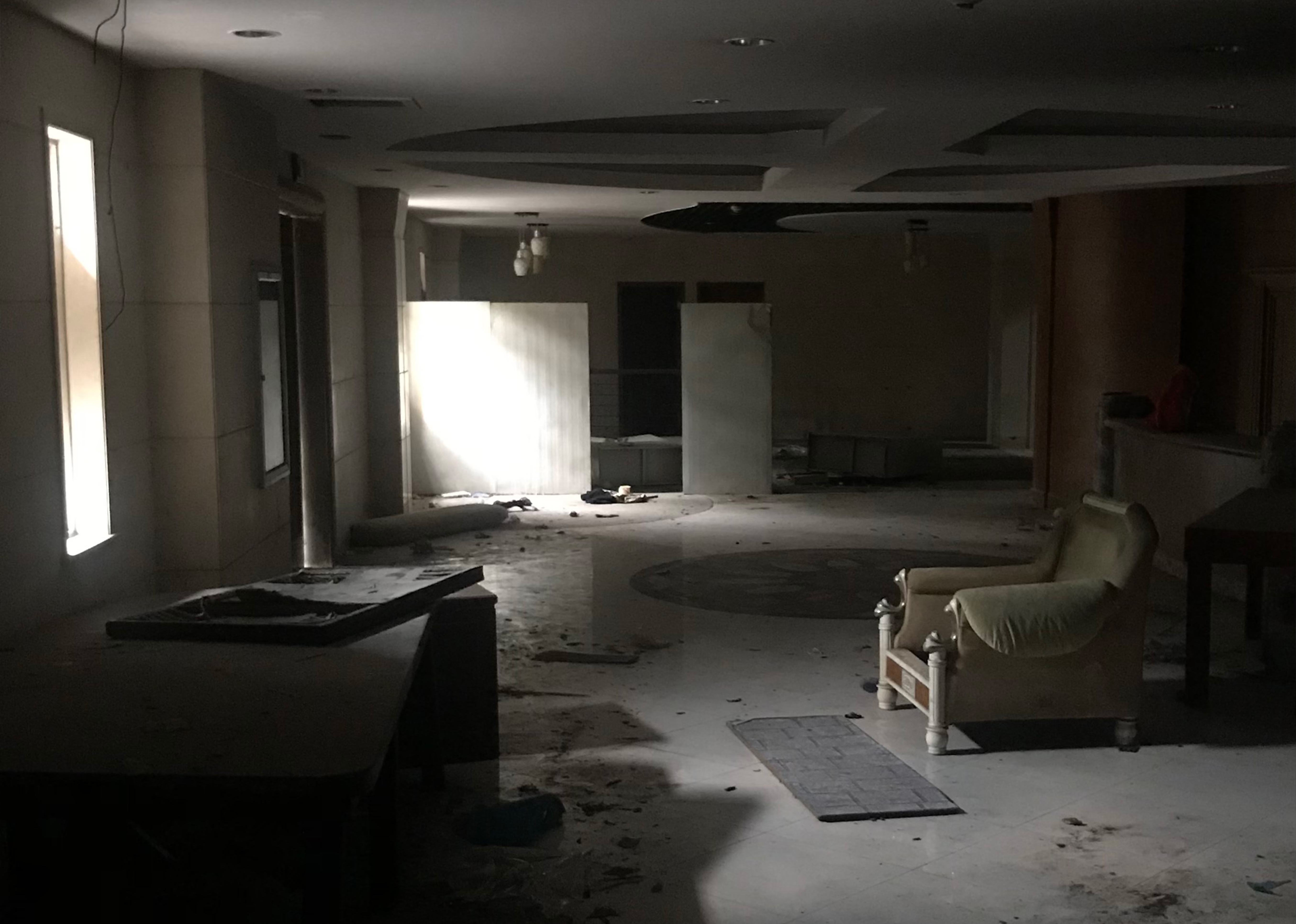 En haut de la colline se trouve le château. Il faut marcher 15 minutes pour y accéder et aujourd’hui, il n’y a que moi. Des planches bloquent les fenêtres et de solides cadenas les portes. Une entrée a été créé par d’autres explorateurs et je décide de m’y engouffrer… En passant par la fenêtre, j’arrive dans une toute petite pièce vide dont la fonction d’origine est difficile à déterminer. Celle-ci donne sur un couloir puis un hall. Dans cette grande salle qui servait d’accueil, le comptoir a été vidé et les armoires renversées. Un bruit se fait entendre, il est à la fois éloigné mais très prononcé… comme une sorte de machine qui soufflerait en continu…