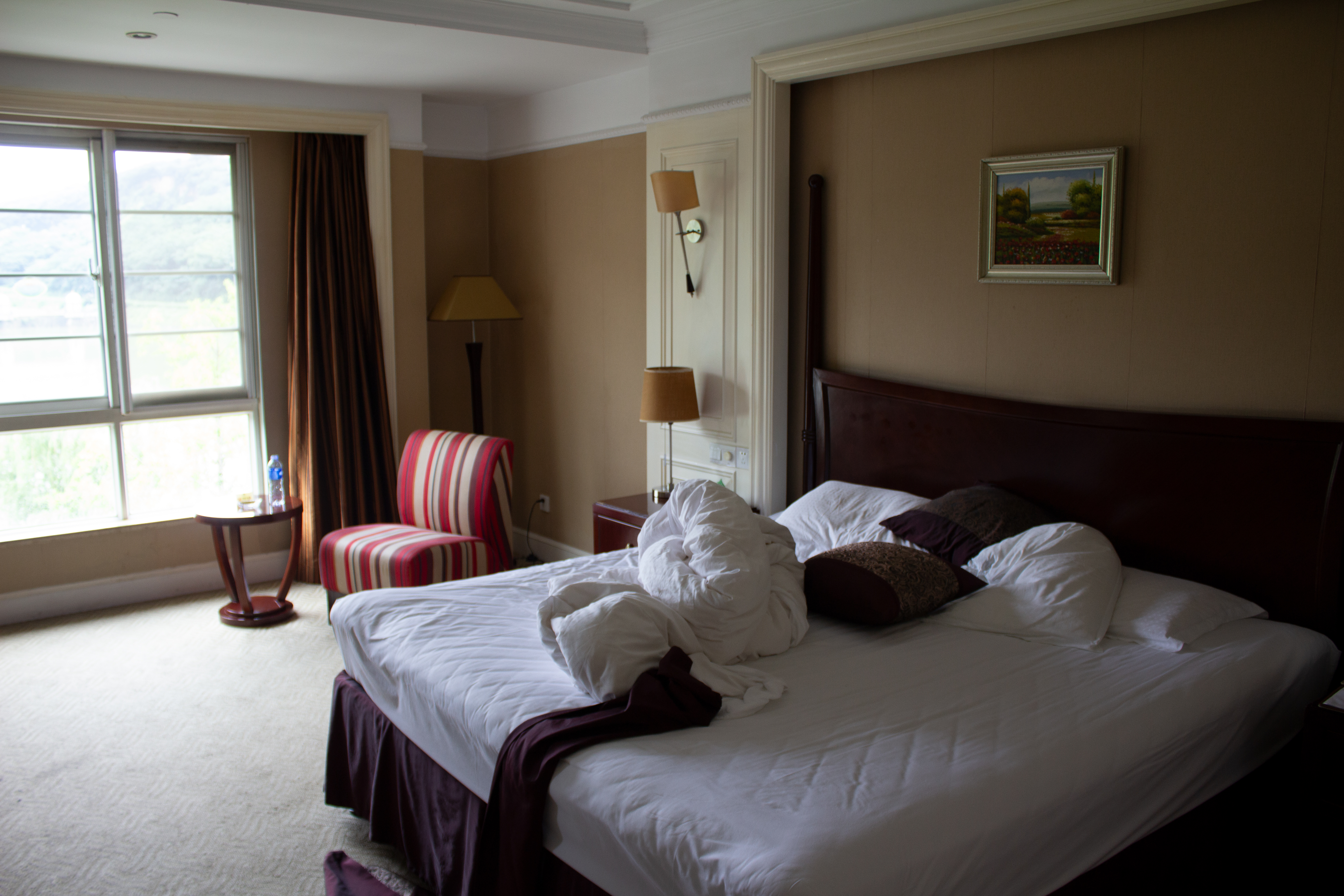 Devant l’hôtel, je découvre la première fontaine en état de marche de la ville… L’intérieur du bâtiment est des plus luxueux avec de nombreuses copies de tableaux français, un restaurant, un bar, une piscine et des cours de tennis. Au rez-de-chaussée, de grandes salles servent pour des séminaires.