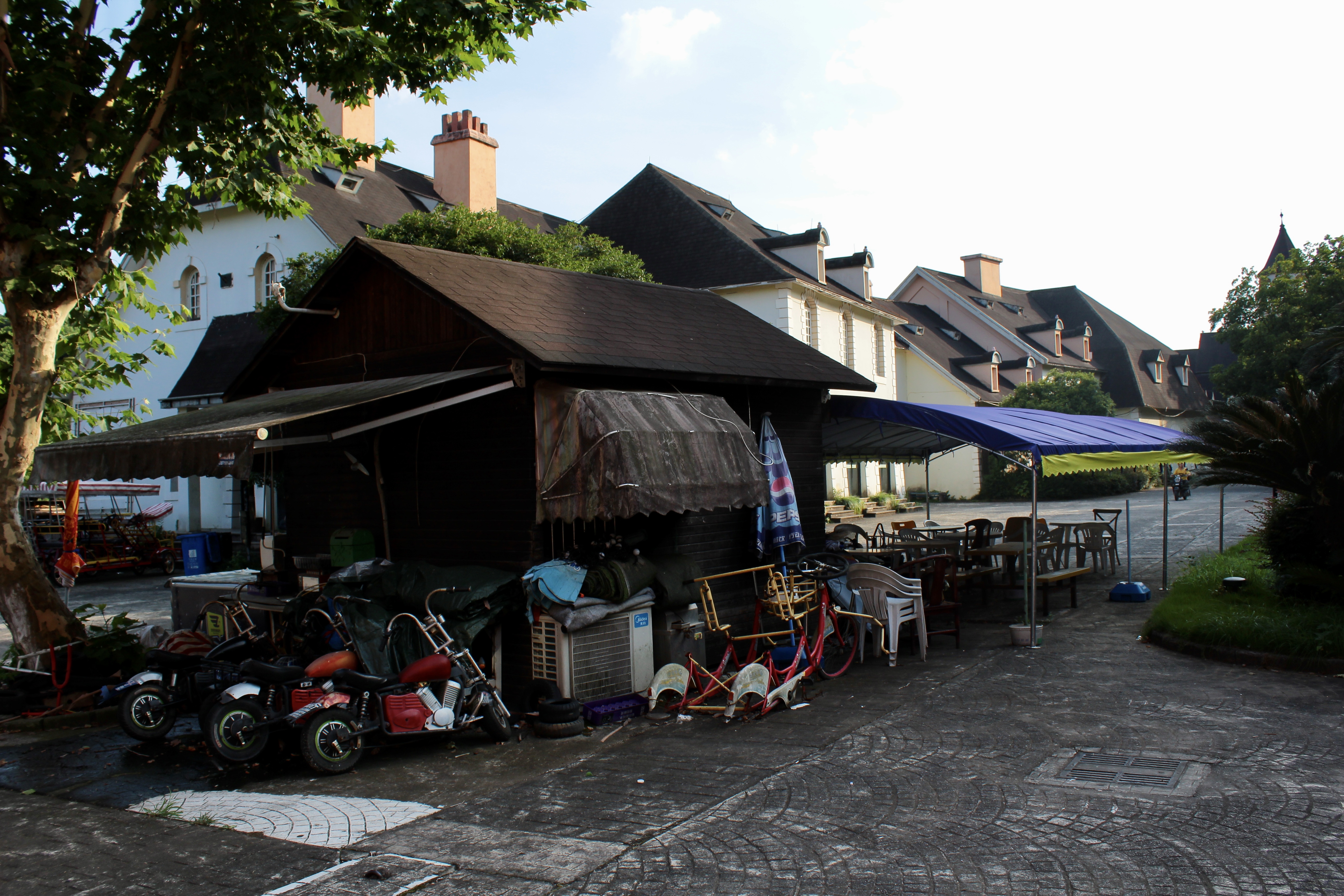 Je décide de me rendre aux dortoirs. La majorité d’entre eux est en chemin lorsqu’on se rend au parc à partir de l’hôtel. Les espaces extérieurs ainsi que l’aspect des bâtiments dénotent avec ceux de l’avenue de la Tour Eiffel et de l’hôtel 5 étoiles. Les toitures sont abimées, des tuiles plates manquent, parfois sur de grosses parties, n’assurant plus l’isolation des édifices. Des meubles, des toilettes, des roues inutilisables sont entreposés à côté des dortoirs.